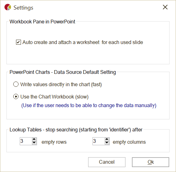 When using this setting, a workbook will be created for each slide where you have to link data from a worksheet. Use this when you want to automate the reporting. Create Lookup Tables and Ranges and Linked Ranges from the original data in the worksheet attached to the slide. The next report (e. g. next period), you only have to use the 'Replace Worksheets' function to replace the old data with the new data and you can refresh the whole report with the new data in one click.